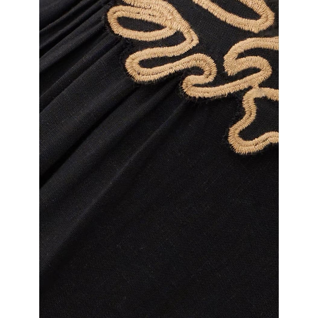 落ち着いたブラックベースに胸元と裾の刺繍が映え、スタイリングに程よい存在感をプラスします。