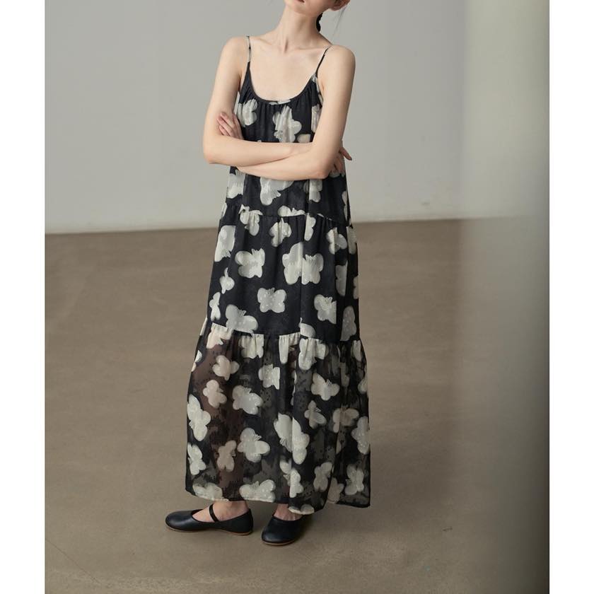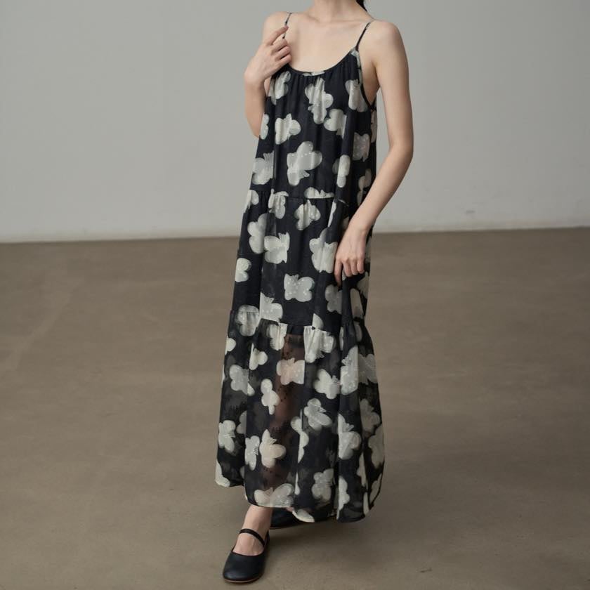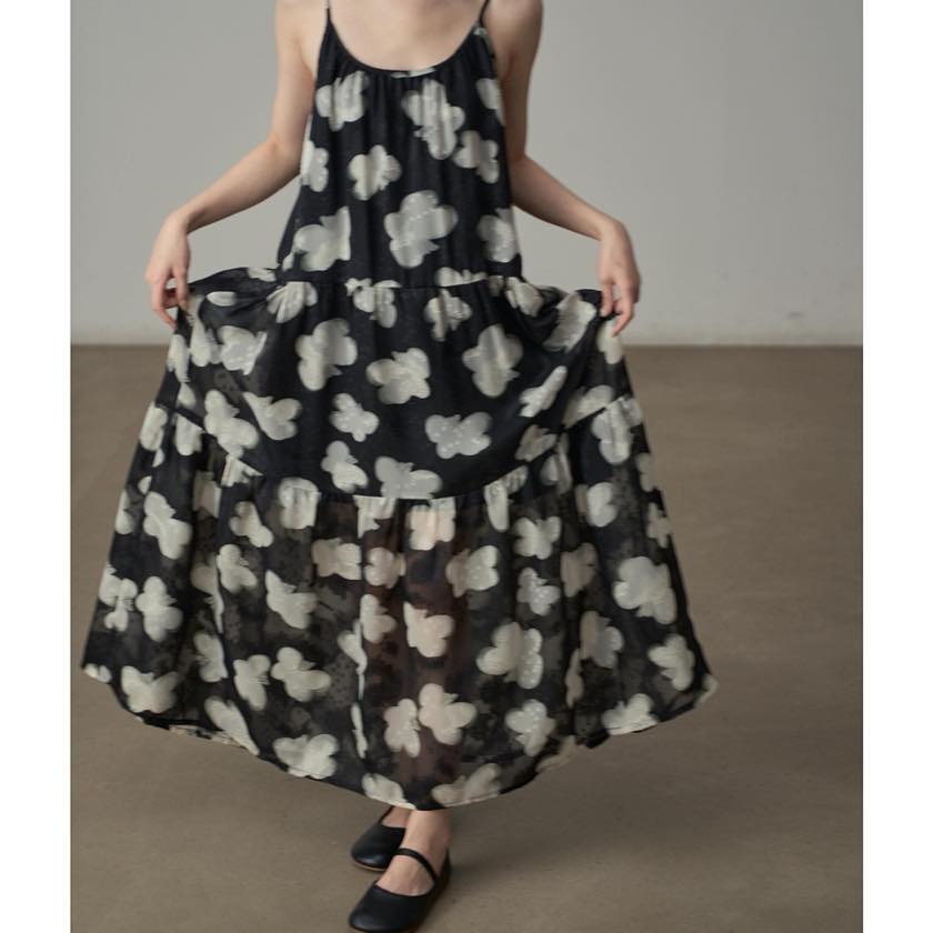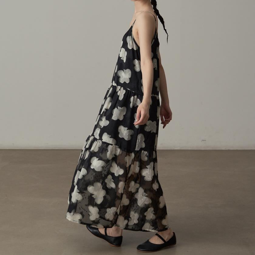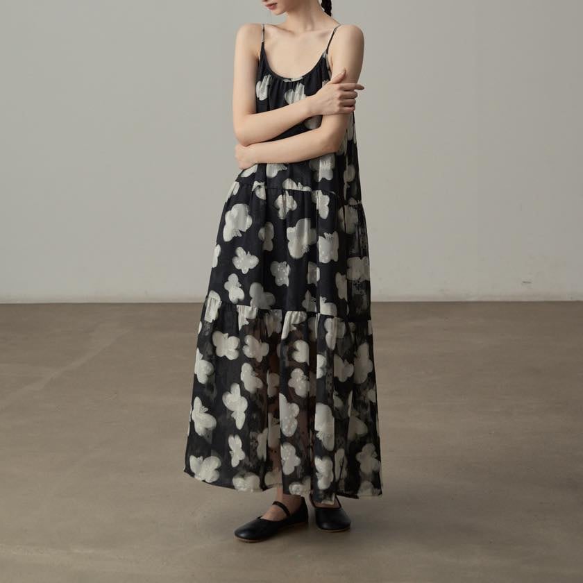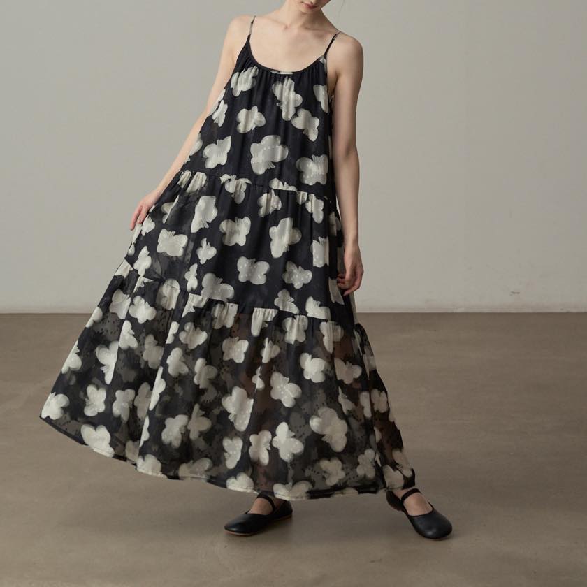 軽やかに揺れる、モノトーンフラワーが印象的なキャミソールワンピース。
