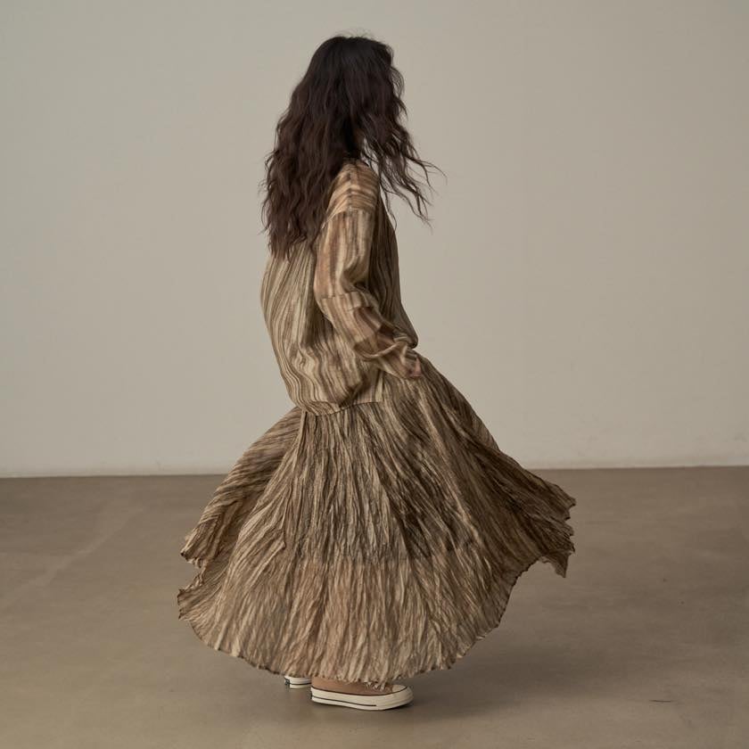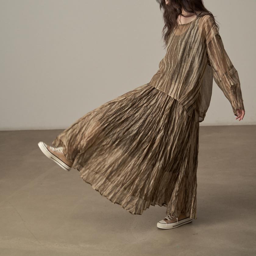 ブラウンを基調としたやわらかな色合いと流れるような柄が、スタイリングに奥行きを添えます。