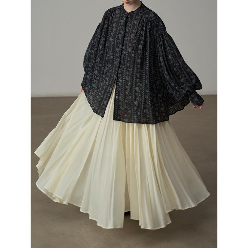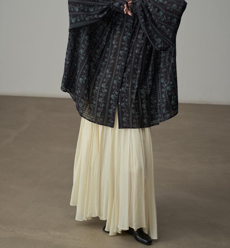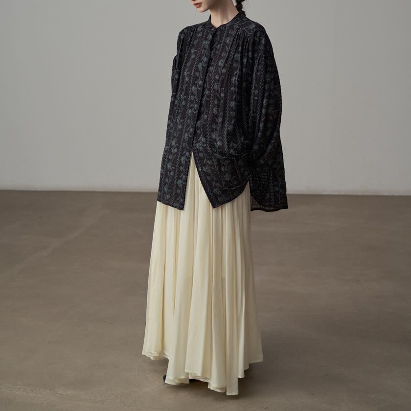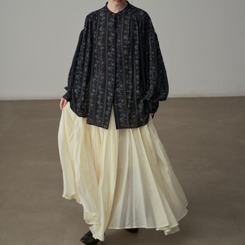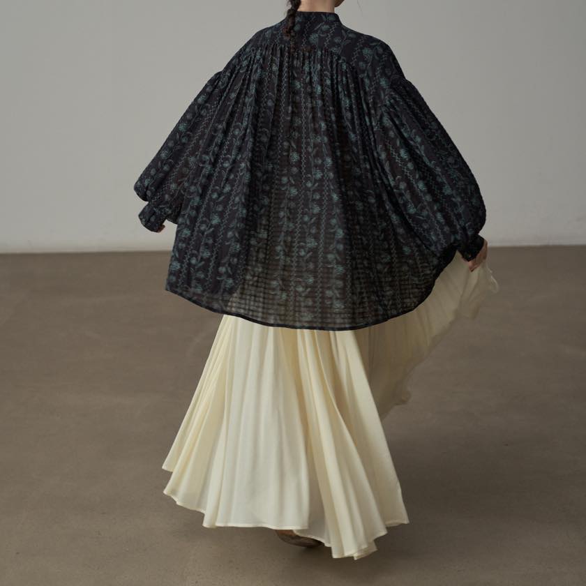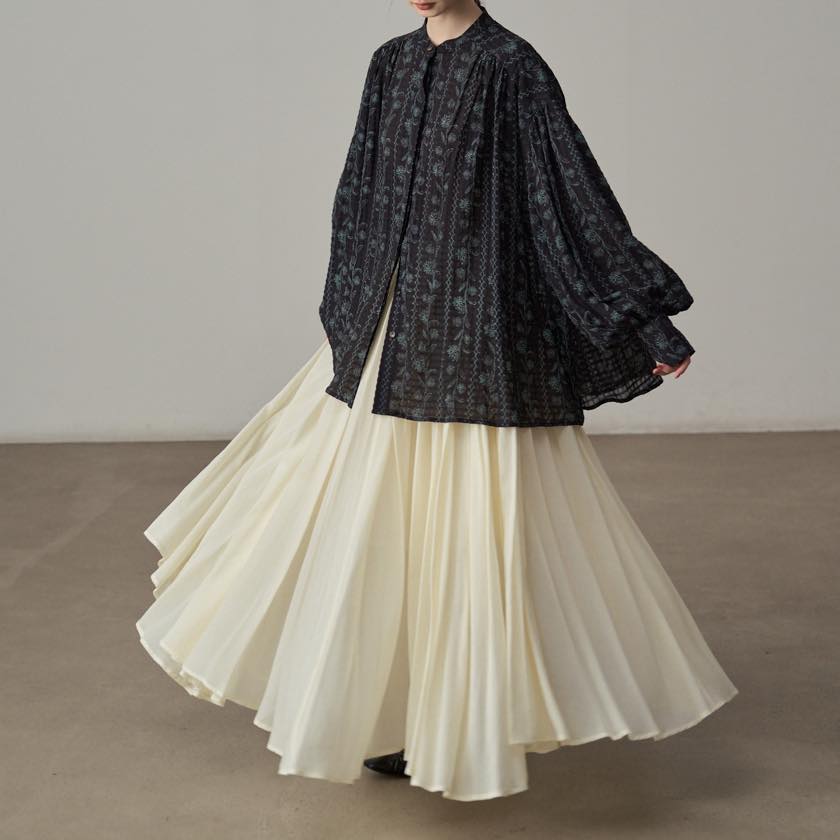たっぷりと寄せたギャザーが、動くたびにふわりと揺れ、印象的なシルエットをつくります。