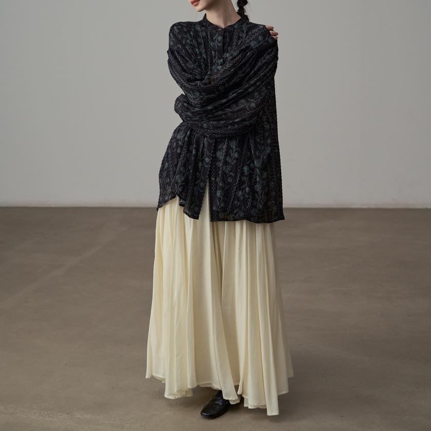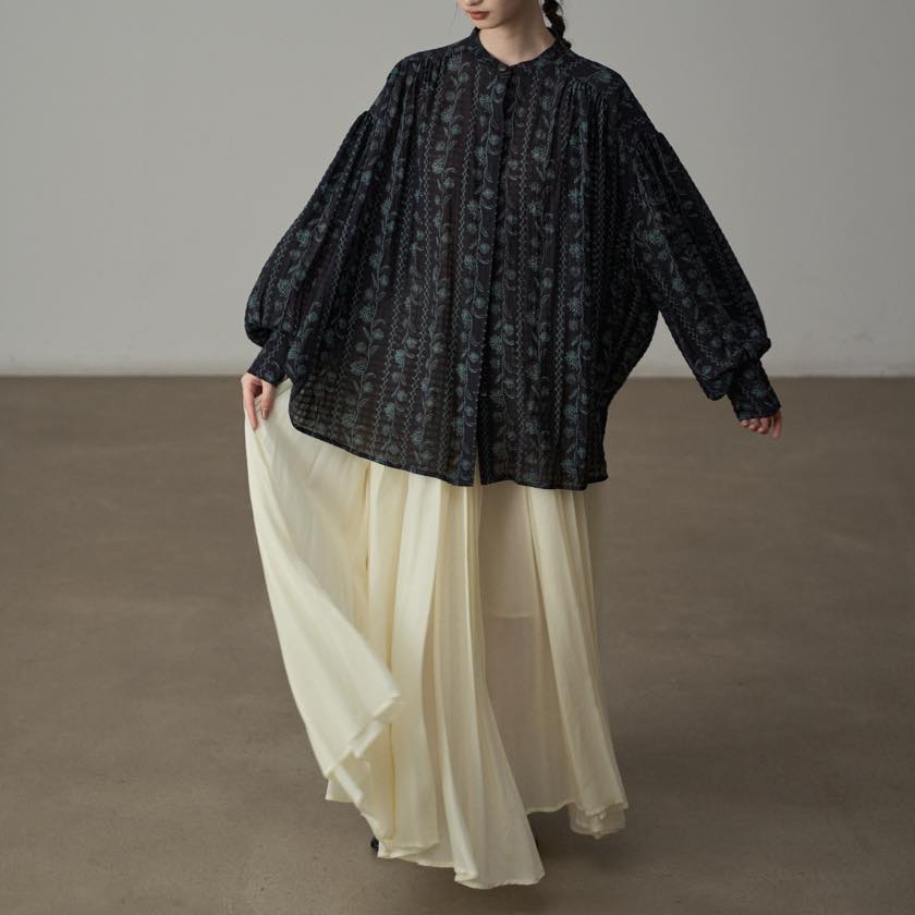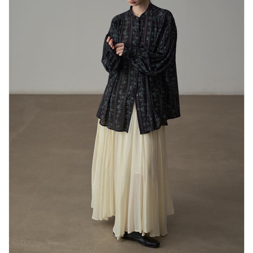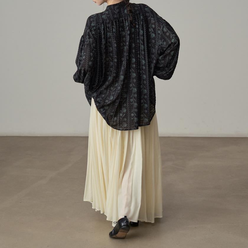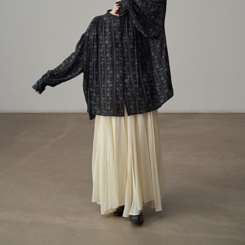 たっぷりと寄せたギャザーが、動くたびにふわりと揺れ、印象的なシルエットをつくります。
