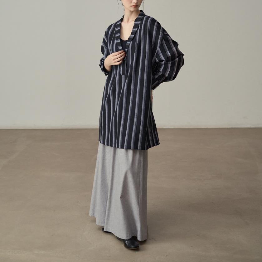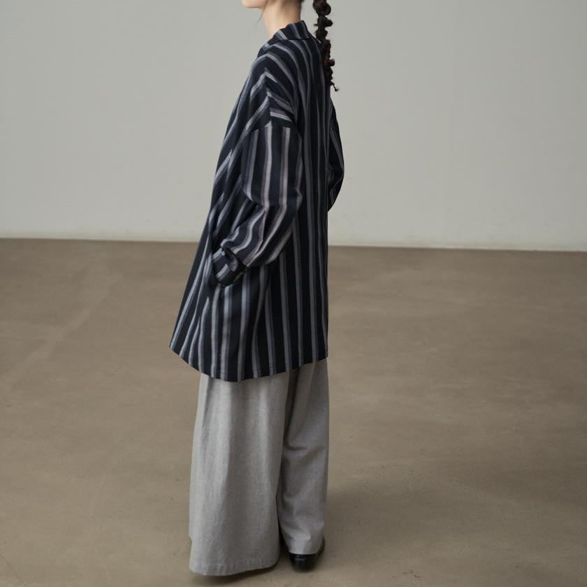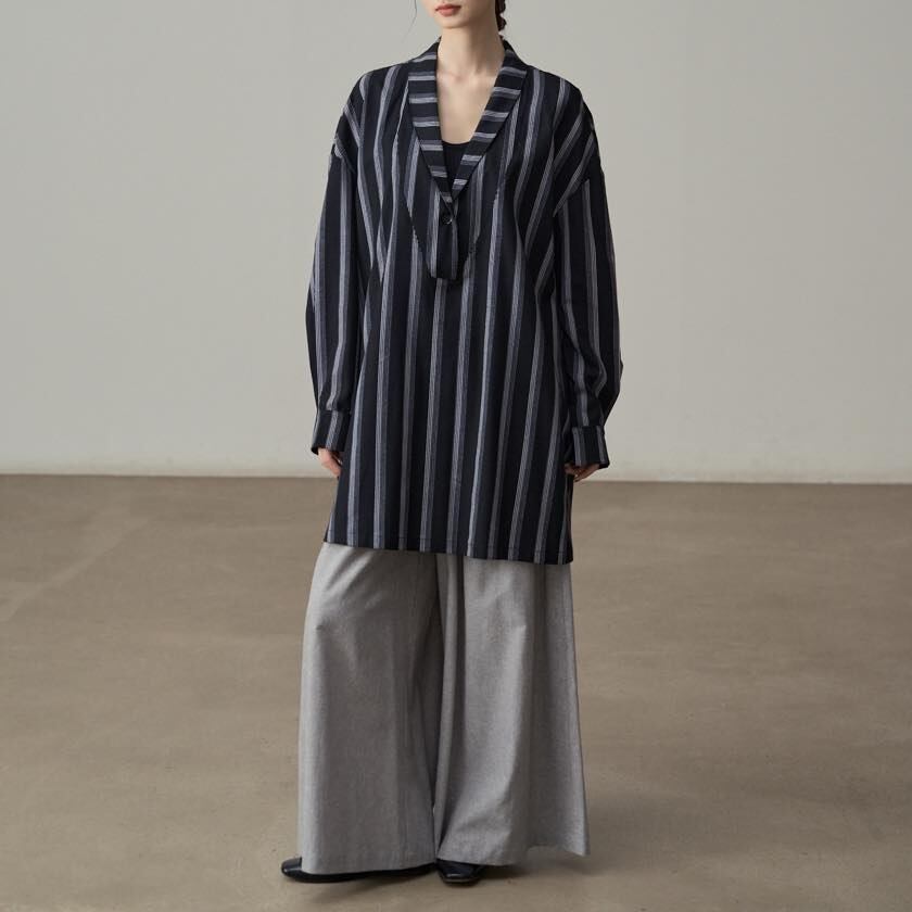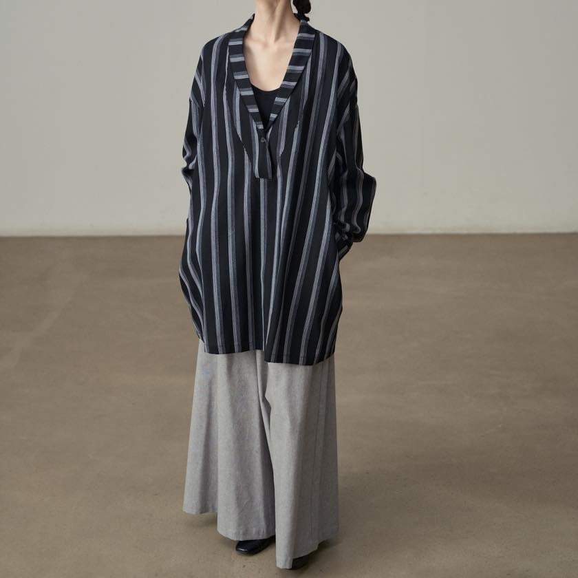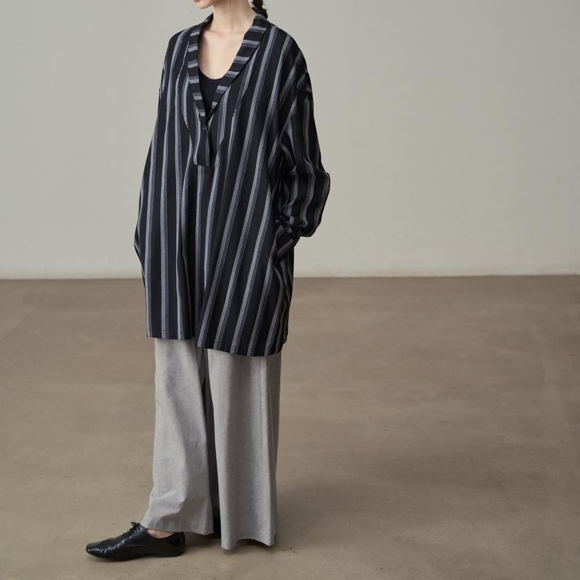 直線的な柄と、ゆとりのあるシルエットが、シンプルな中に奥行きを生み出します。