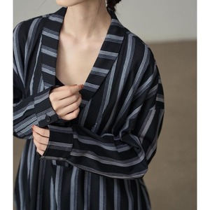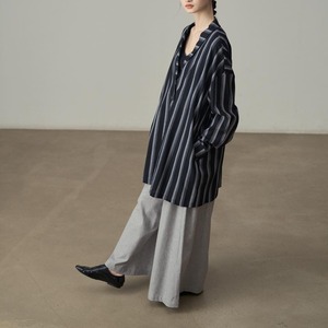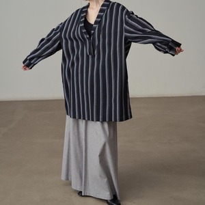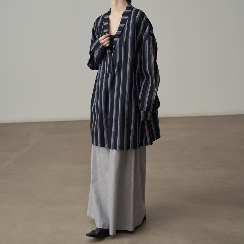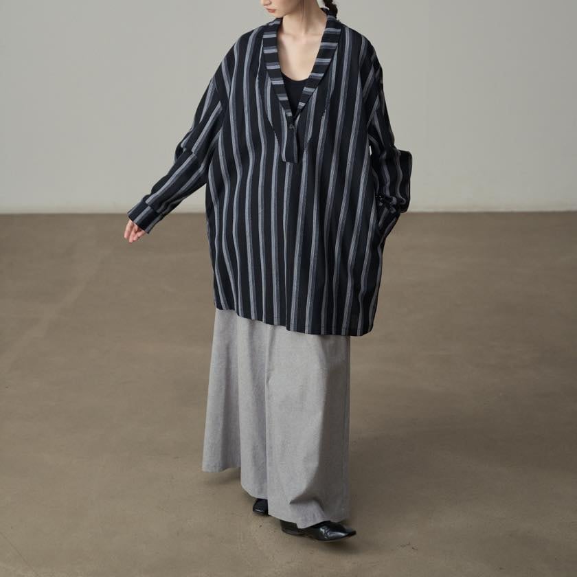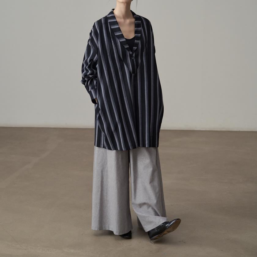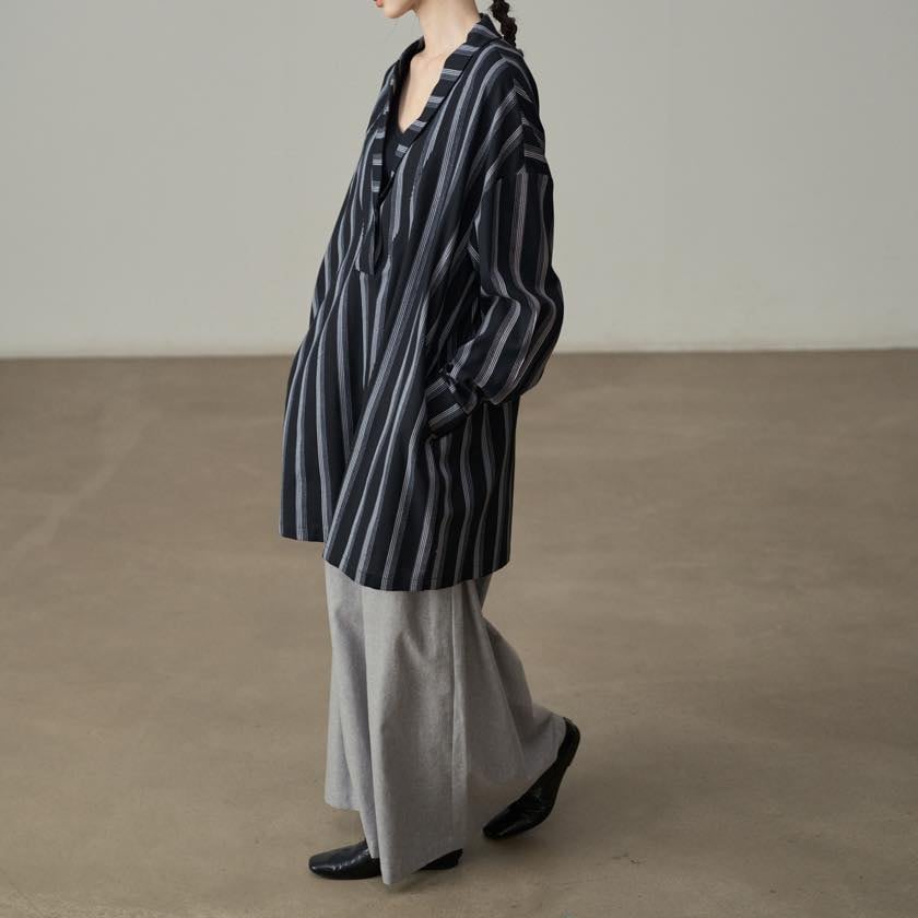直線的な柄と、ゆとりのあるシルエットが、シンプルな中に奥行きを生み出します。