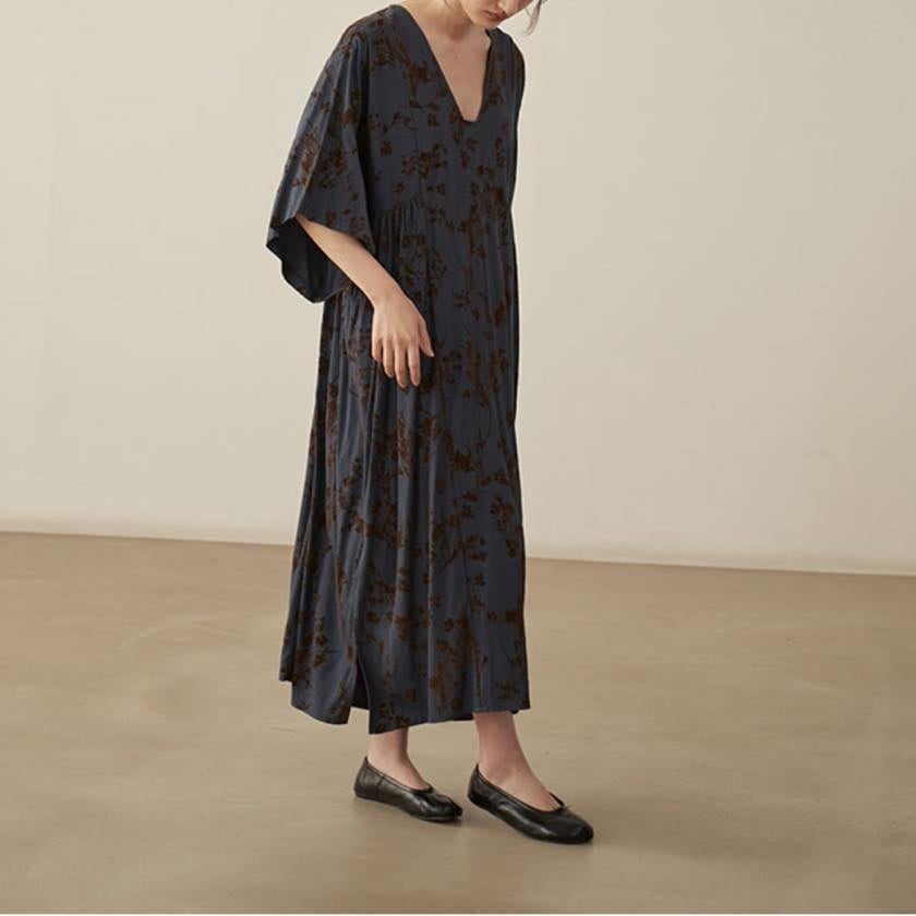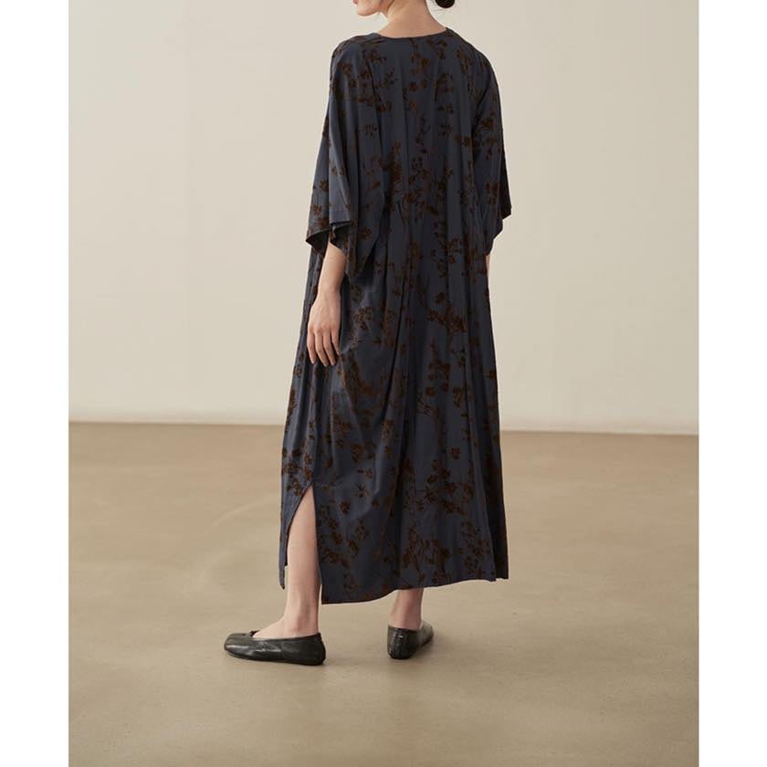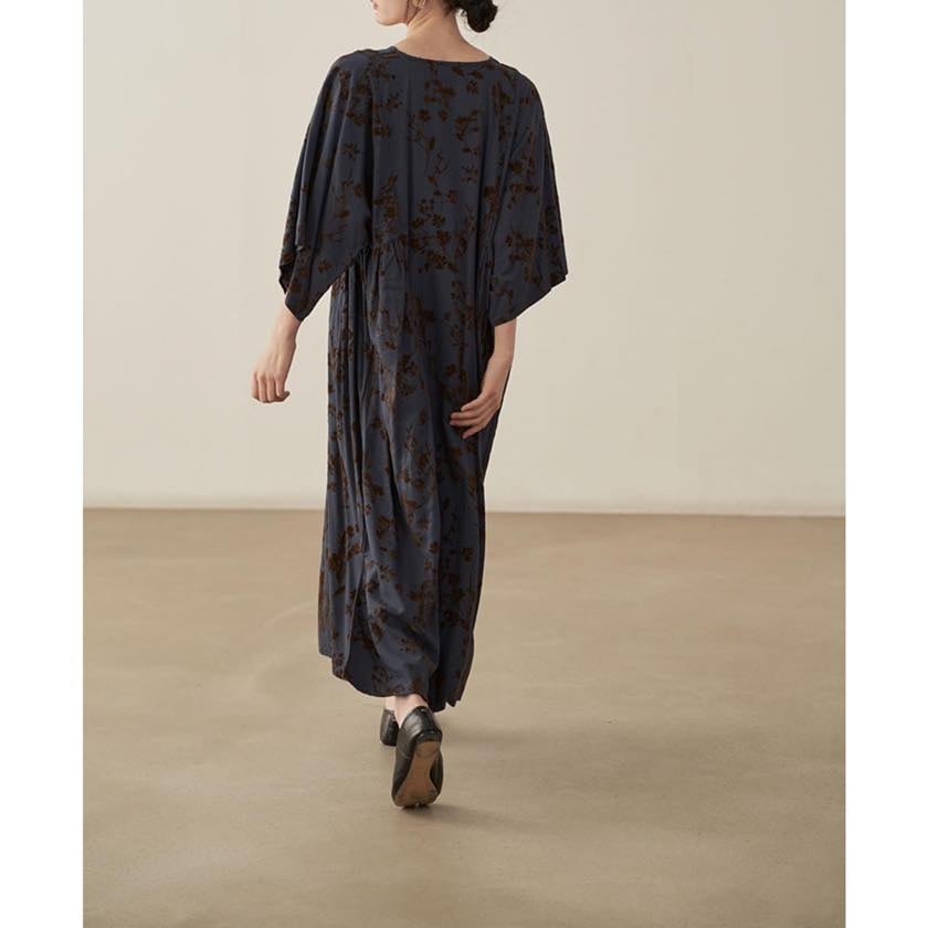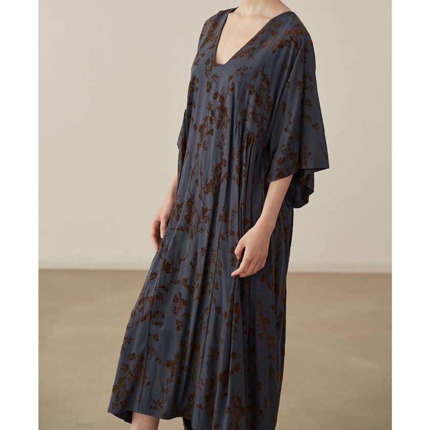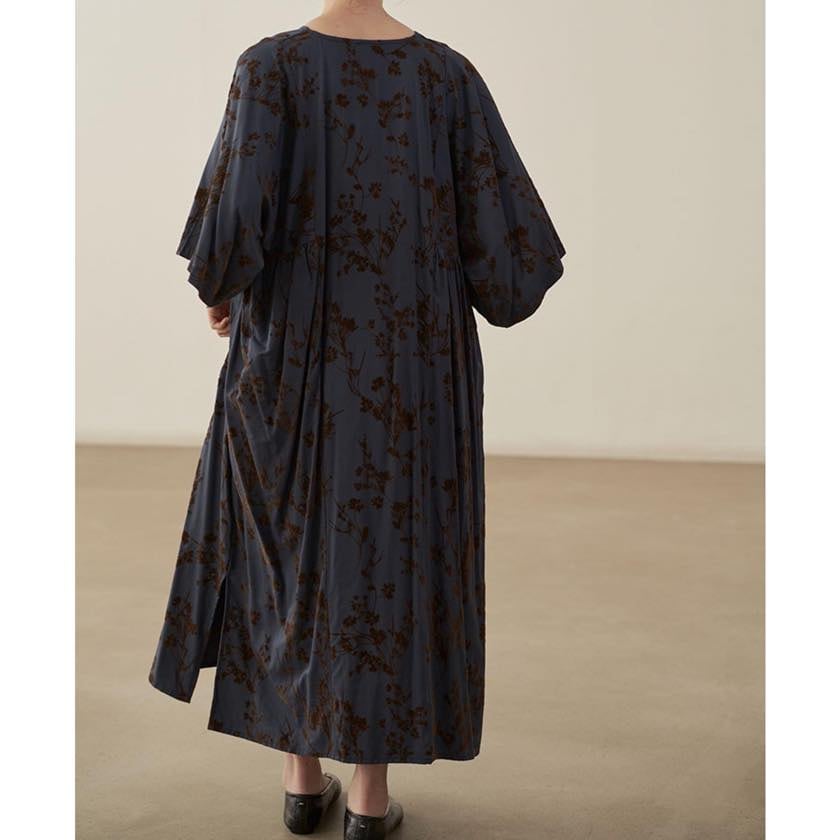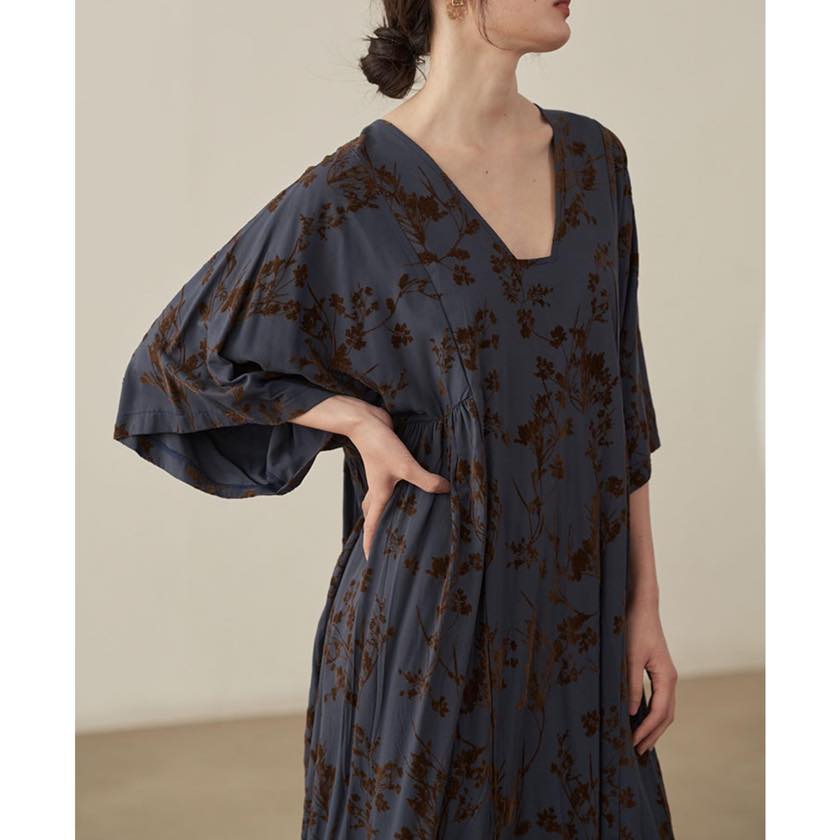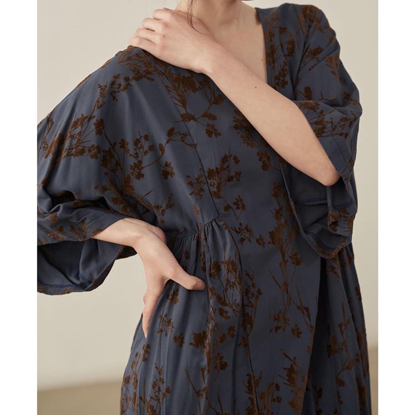 深みのあるカラーに浮かぶ、静かな花模様が印象的なワンピース。