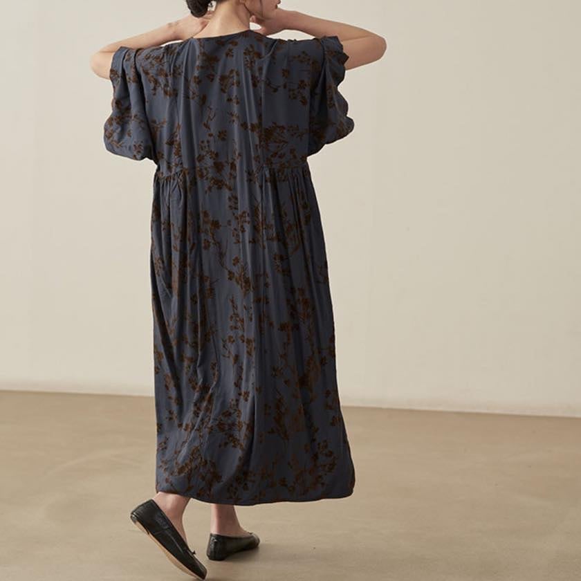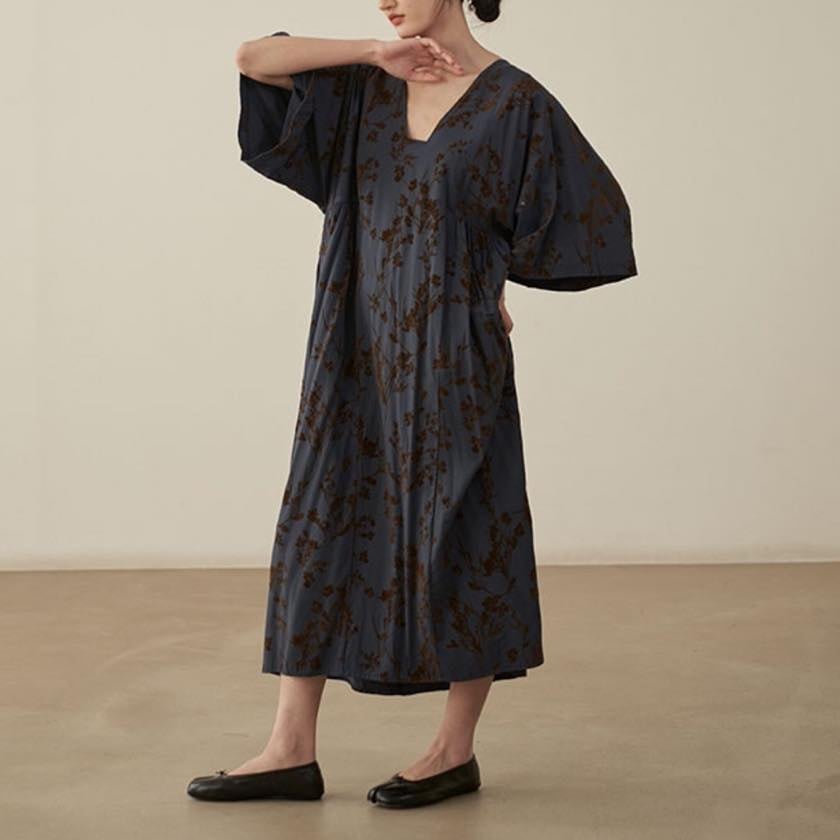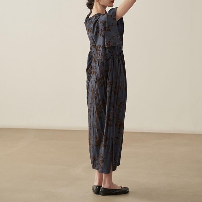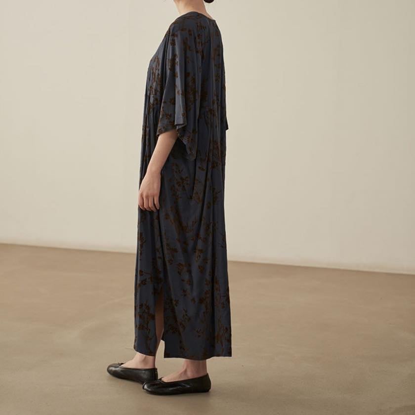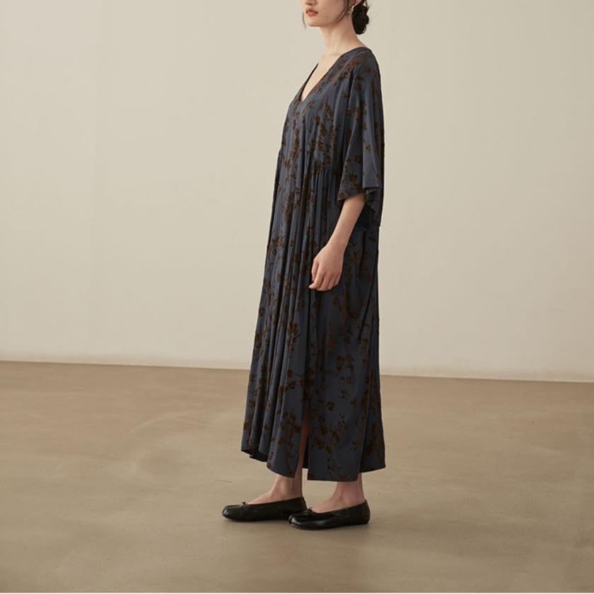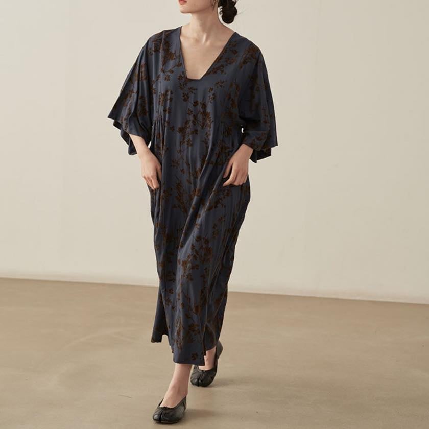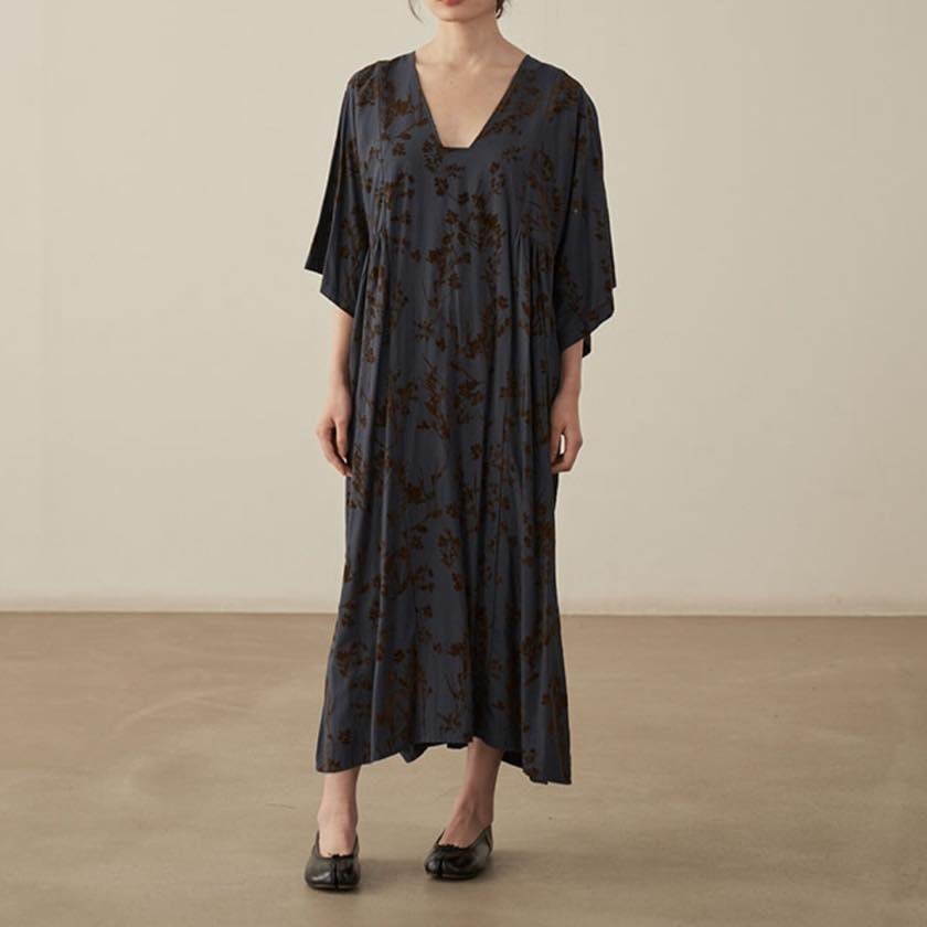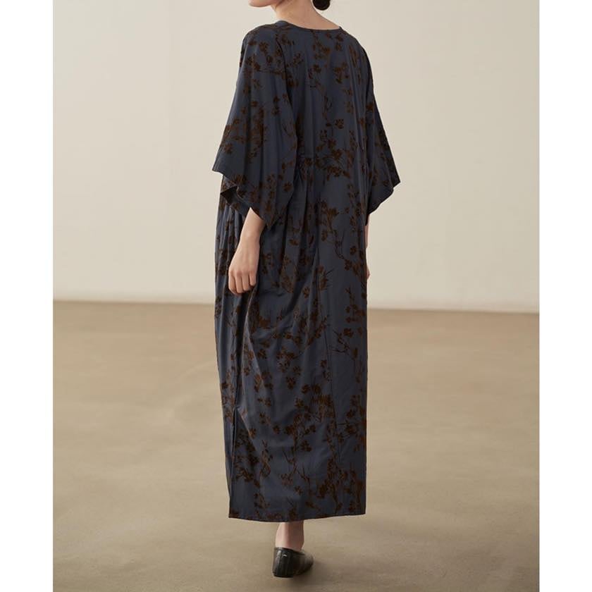 深みのあるカラーに浮かぶ、静かな花模様が印象的なワンピース。