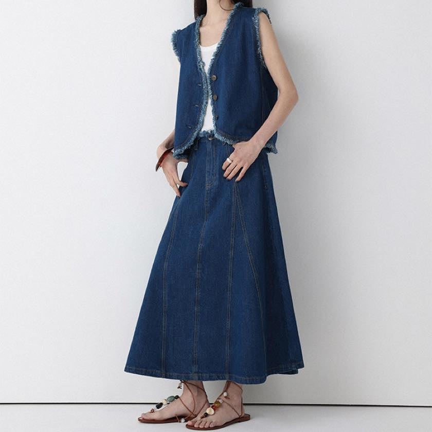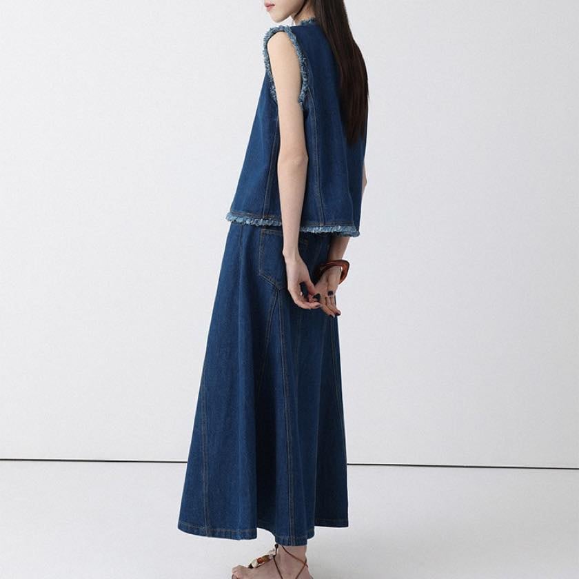 同素材のデニムベストと合わせたセットアップスタイルもおすすめ。